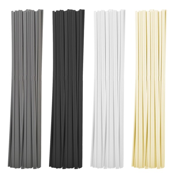 白色、灰色、黒色、米色の4色展開。ABS、PVC、PP、PE各10本のセット内容で、さまざまなプラスチック溶接ニーズに対応します。プラスチック溶接機としても活用可能。