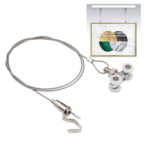 【応用】:絵画、ポスター、写真と他の作品展示用の吊下げ金具です。掲示物から下にはみ出したワイヤーは丸めて裏にまとめることで、すっきりとした外観となり問題ありません。白い壁でも目立ちにくいです。注:U型ピクチャーレール用 。