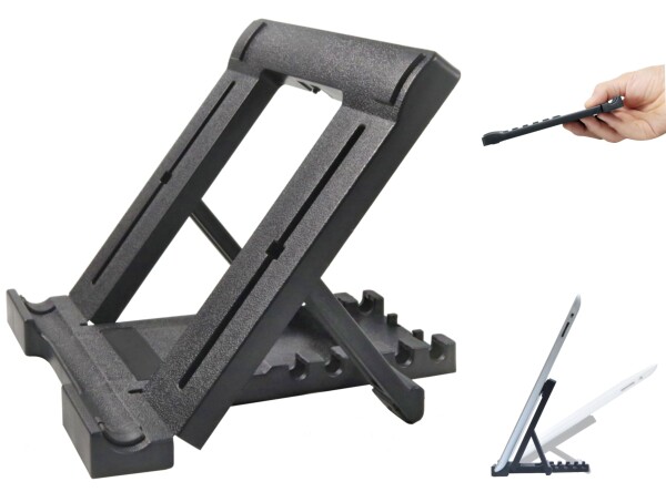 薄型 コンパクト、角度調節機能付 折り畳み式 タブレット & スマートフォン 卓上 スタンドです。薄型・軽量、コンパクト、折りたたんだ状態では場所をとりませんので持ち運びや保管が便利です。縦置き・横置き、どちらでも使用可能です。5段階で自由に前後の角度調節が出来ます。卓上での 写真、イラスト などの 画像、動画鑑賞、映画鑑賞、ネットサーフィン、Face time、Skype などの動画電話、アプリ などの ゲーム、キッチンでの料理レシピを見ながらの調理やクッキング、電子書類