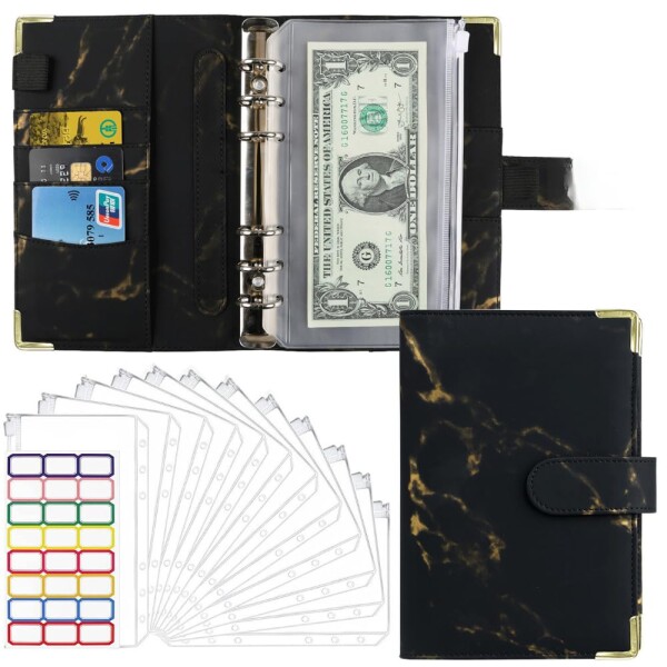 ideamall 家計管理 ポーチ 家計簿 予算バインダー ファイル ポケット12個付き お金管理 予算管理 大理石 A6 (ブラック)