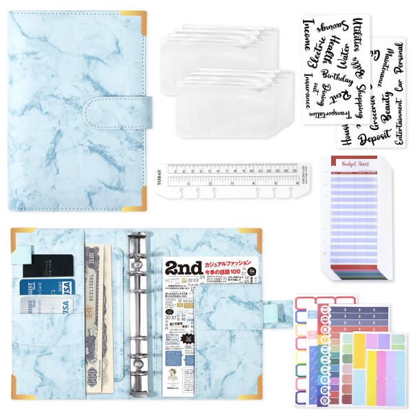 【便利なセット】PU製バインダー+8枚のファスナーポケット+ラベル7枚+予算シート12枚+分類シール2枚+定規1枚、商品が手に届くとすぐにご利用いただけます。