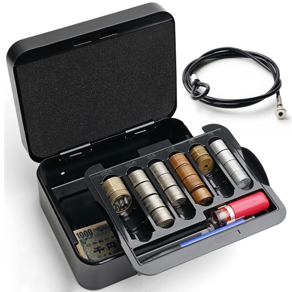 | 商品名 | 手提げ金庫 小型 お金管理 各額硬貨 収納可能 ワイヤ付き B6サイズ 家庭用 オフィス ダイヤル式 ブラック |