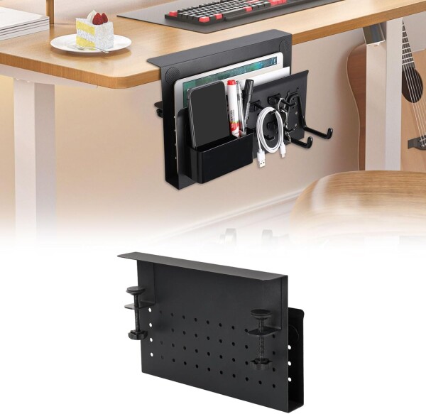MIAODAM デスクサイド収納ラック クランプ式 ノート PC/タブレット/書類収納 フック スチール製 耐荷重 18kg 机の下 フック4個 ペンホルダー付属 放熱穴付き 机下収納 マグネット対応 オフィス/自宅用 (炭黒)