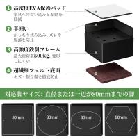 【高さ調整脚】材質: 鉄 (本体) / フェルト (床接触部) / EVAエチレン酢酸ビニル共重合体 (家具接触部)。セット内容: 4個、適用サイズ: 直径または角辺80mm以内の脚。 おすすめ用途:・こたつ ・ダイニングテーブル ・ソファ ・ベッド ・冷蔵庫 ・洗濯機 ・本棚 ・TV台