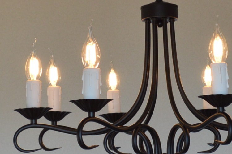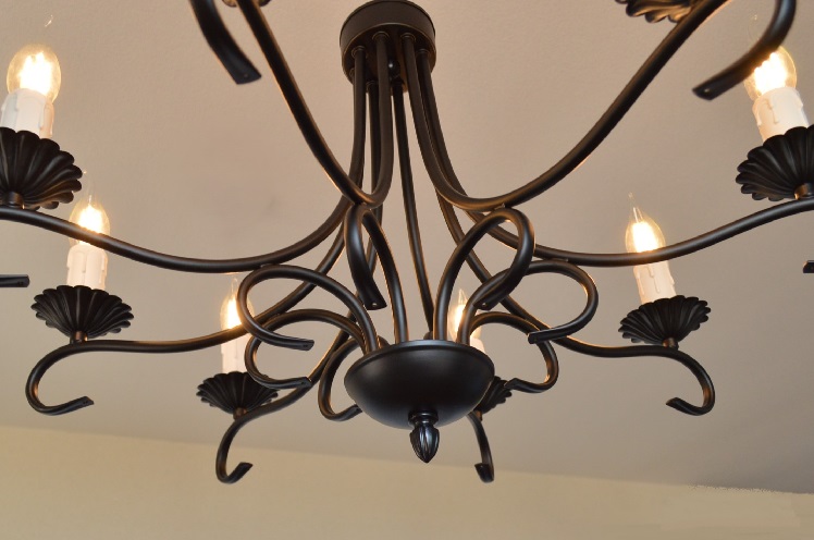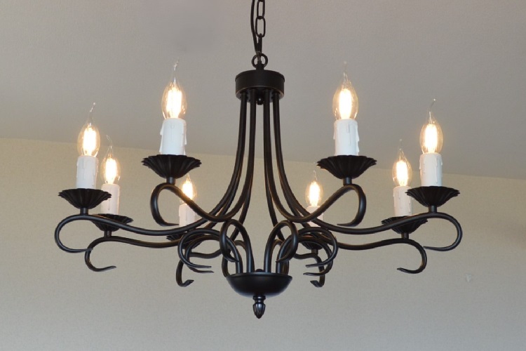 おしゃれなシルエットの8灯シャンデリア。しっかりとした作りの重厚感のある鉄製で、ヨーロッパ伝統ロートアイアン、手作りの温もりが伝わってきます。どんなインテリアにもシンプルに馴染むマットなブラック。ロールしたアーム、豪華で美しいシルエットを描いています。アームの先には8灯のろうそくが灯るようなライトが飾られて中世ヨーロッパな雰囲気。下から見上げても美しいデザインです。迫力の大きさで、ラウンジやビストロなど広い空間のポイントとなるシャンデリアとして。または、吹き抜けや、ホールなどの空間を印象付ける照明、もちろんアトリエやロフト等のインテリア兼照明として。