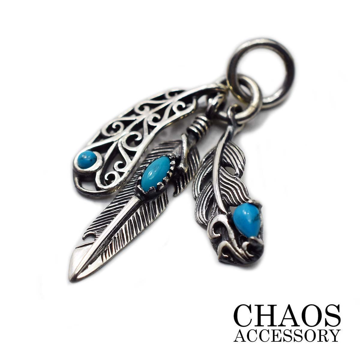 40mm シルバー ミニフェザー 3点吊り ターコイズ 天然石 シルバーアクセサリー メンズ シルバー925 レディース ペンダントトップ