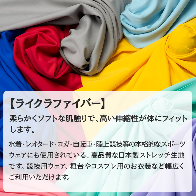 柔らかくソフトな肌触りの国産生地となります。高い伸縮性が体にフィットします。水着やレオタード、ヨガ・自転車・陸上競技等の本格的なスポーツウェアにも使用されています。コスプレ用途でもボディスーツや水着、様々な用途で活躍すること間違いなし!シワになりにくく型崩れもしにくい高品質生地となります。