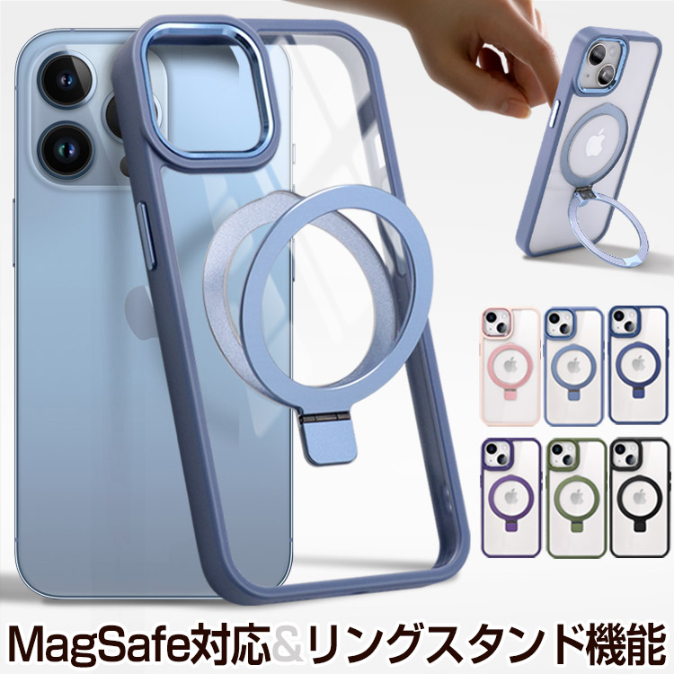 特徴 | ・Magsafe対応リング部分はケース背面に収納可能、フラットなデザインになっています。 ・YouTubeやネットフリックスを楽しむ際にうれしいスタンド機能も搭載。 ・縦置きや横置き、また角度調整も行えるため様々な状況で活用できます。 ・背面クリアのため、トレカやステッカーを挟むことができます。 ・カラーバリエーションは全6色、淡いカラーからダークトーンまで広く取り揃えました。 | |