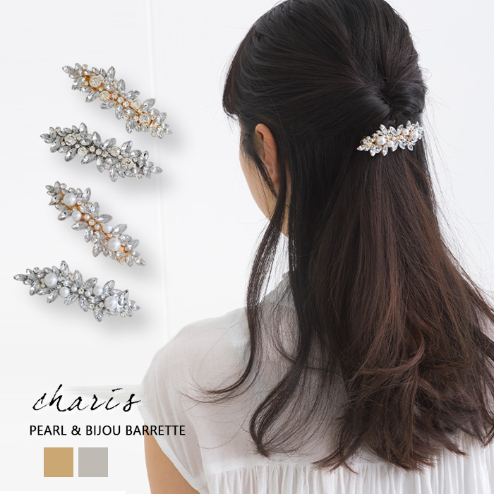 艶感のあるパールと控えめに輝くビジューの上品さが素敵なバレッタ。