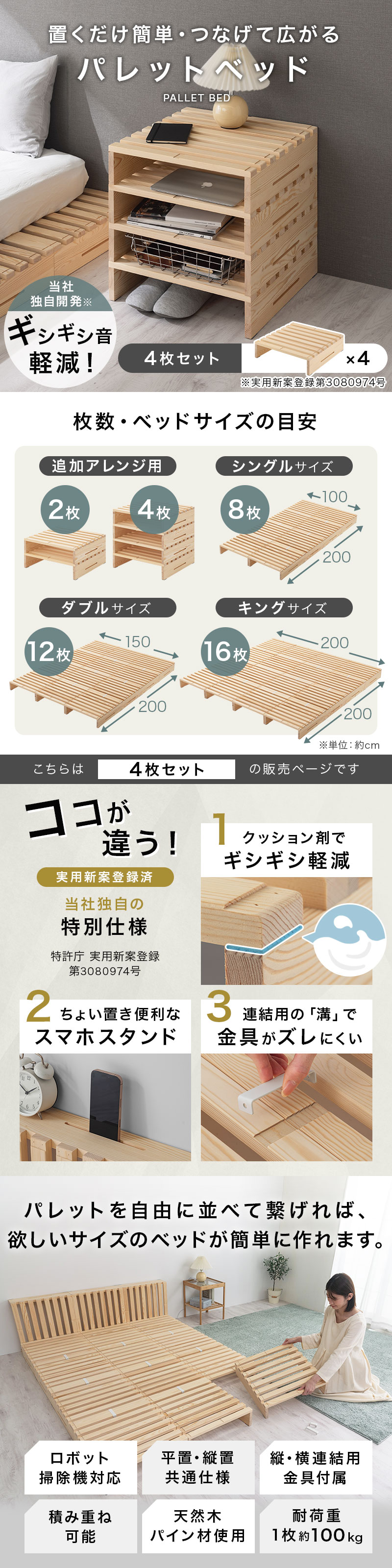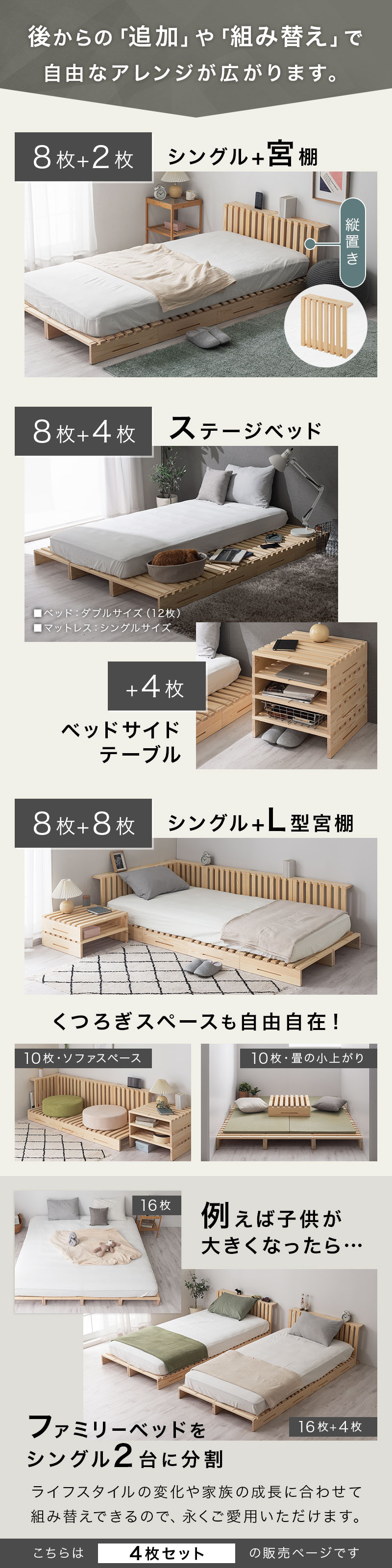 追加用 バラ売り 4枚 セット ベッド パレットベッド すのこベッド ステージベッド ヘッドレスベッド ベッドフレーム 木製ベッド ウッドベッド ローベッド フロアベッド 組み合わせ 繋げる 繋がる 連結 拡張 シンプル おしゃれ 送料無料 新生活 部屋 おしゃれ 爆買