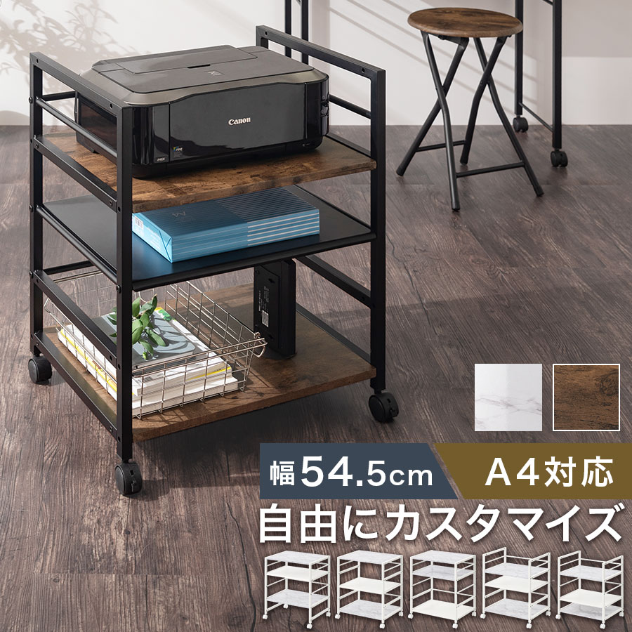 プリンター台 プリンターワゴン サイドワゴン キャスター おしゃれ 3段 スリム 木製 スチール 約 幅55cm A4ファイル対応 大理石風 アンティーク調