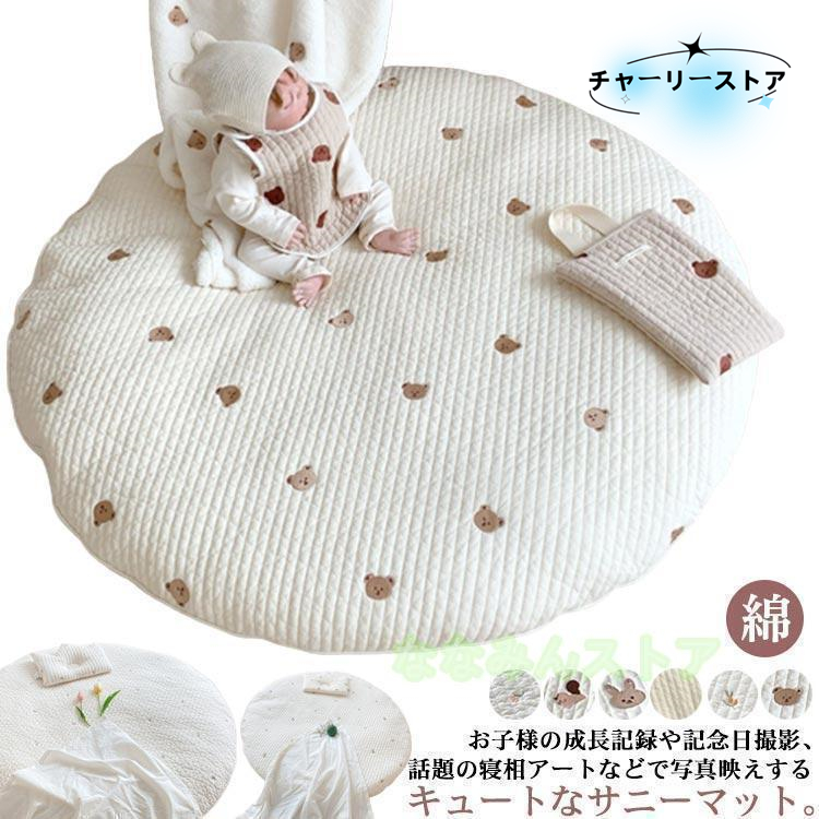 サニーマット ベビー ラグ マット 円形 ごろ寝 寝相アート 月齢フォト マット 綿 赤ちゃん お昼寝マット 刺繍 クマ 花柄 ウサギ リス オリーブ