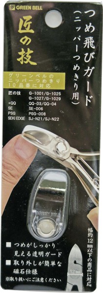 ★対応品番★以下GREEN BELL グリーンベル社商品10品番に対応 G1001、G1025、G1027、G1029、SE006、QQ03、QQ04、PSG008、SJN21、SJN22 ※幅約12mm以下の商品に対応しております。 ◇ニッパーつめきりの刃先に付けることでつめの飛び散りが軽減されます。 ◆つめが落ちる側にガードを取り付けご使用ください。 ◇切ったつめがつめ飛びガードに跳ね返り、下に落ちるので飛び散りにくく、後片付けが楽になります。 ◆磁石を使用していますので、付け外しがしやすくなっています。 ※非常に強力な磁石(ネオジム磁石)を使用しています。取扱いには十分に気を付けてご使用ください。 |