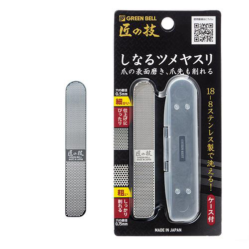 粗目と細めの2WAYタイプ。 目詰まり知らずの大、小2種類の穴でみるみるうちに爪を削ります。 爪の表面が傷つかないように穴のフチを丁寧に仕上げました。 フチがなめらかなのでツメの表面の研磨も可能。凸凹を削り、自然な光沢に磨くことが出来ます。 本体はメッシュ状で、削っている爪が透けて見えるため安心してご使用いただけます。 ヤスリを爪に押し当てると程よく”しなる”のでどんな角度でも爪の形あわせて削りやすいのが特長です。 磨きにくい部分も無理なく磨くことが出来ます。 スプーン等に使われる18-8ステレンスを使ったオーステンレス製なので、丸洗い出来て衛生的。 お手入れ簡単で長くお使いいただけます。 |
