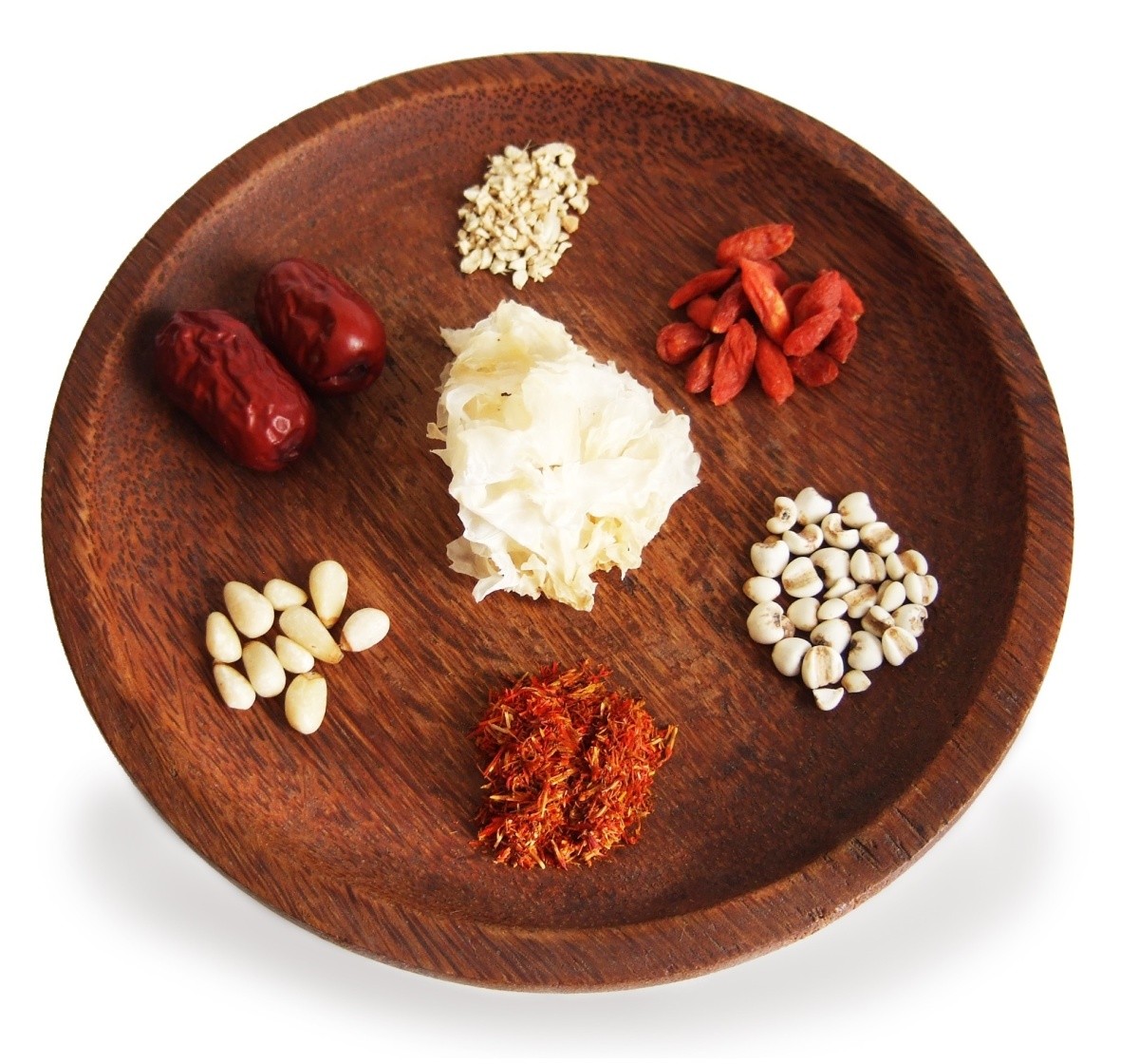 ナツメ・クコの実・白木耳・生姜(ショウキョウ)・松の実・はと麦(ヨクイニン)・紅花・天然天日塩