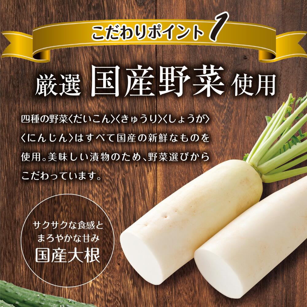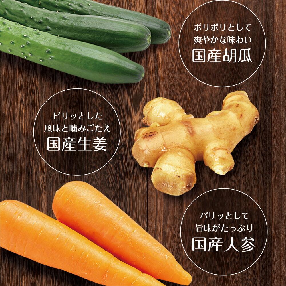 だいこん(国産)、きゅうり(国産)、しょうが(国産)、にんじん(国産)、漬け原材料[しょうゆ、砂糖、ぶどう糖果糖液糖、醸造酢、発酵調味液、とうがらし]/調味料(アミノ酸等)、カラメル色素、酸化防止剤(ビタミンC)、香料、(一部に小麦・大豆を含む)