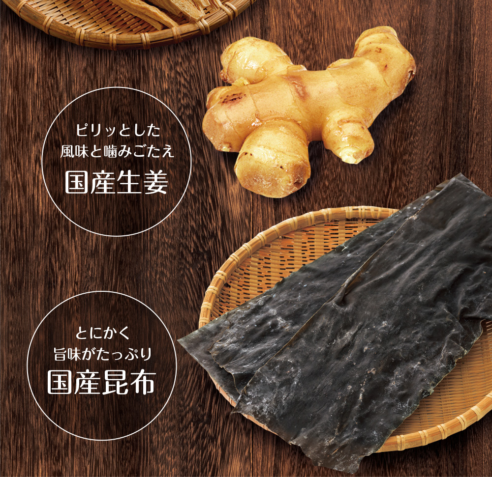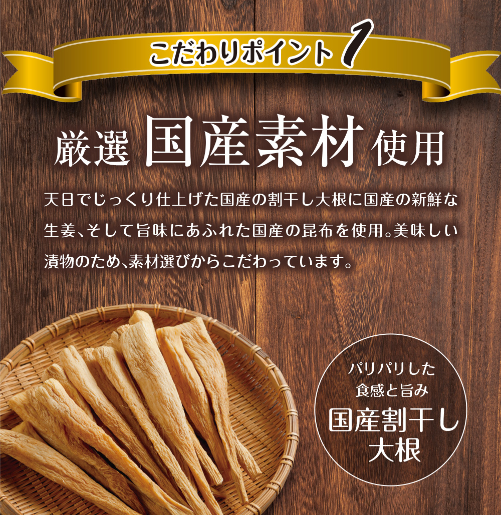 だいこん(国産)、しょうが(国産)、こんぶ(国産)、漬け原材料[砂糖、ぶどう糖果糖液糖、しょうゆ、発酵調味液、醸造酢]/調味料(アミノ酸)、カラメル色素、増粘剤(キサンタンガム)、酸化防止剤(ビタミンC)、(一部に小麦・大豆を含む)