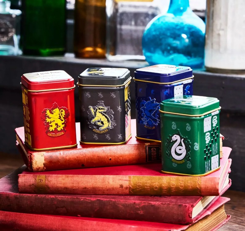 このティーキャディには、ハリー・ポッターの4つの寮、グリフィンドール、スリザリン、ハッフルパフ、レイブンクローの紋章が描かれています。
