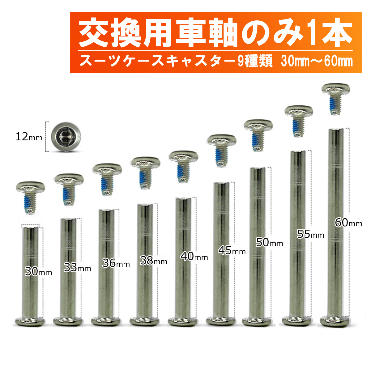破損、劣化したキャスターを自身で交換するための車軸、30mm〜60mm 9種類。