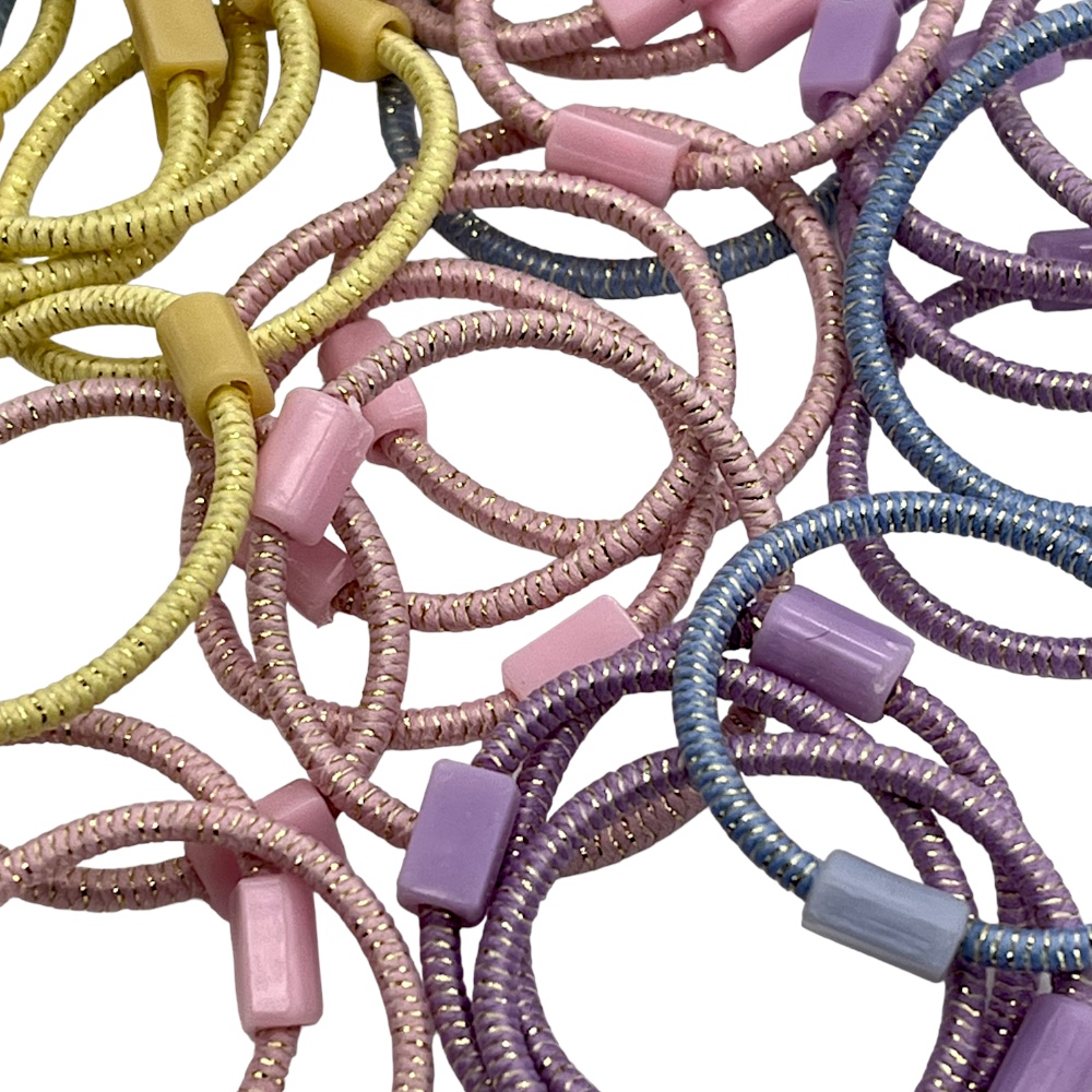 金糸を混ぜたヘアゴムです。金糸が入っているのでキラキラに見えて、シンプルなヘアゴムが明るく演出できます。