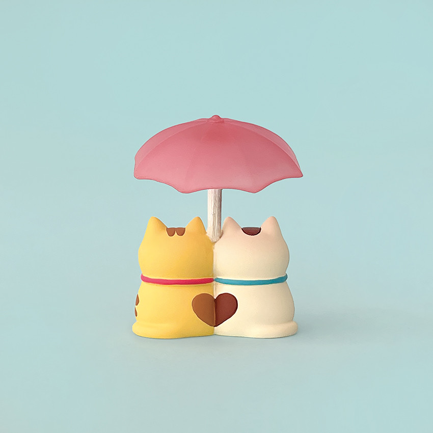 *ひとつの傘で御散歩の仲良しにゃんこ。傘の下ではおしゃべりも弾みます。背中の模様にもご注目…!