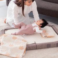 また、赤ちゃんの成長に合わせて オプション品のジョイントマットレスを利用することによって、 自由自在に大きさを変えることができるので、プレイマットやキッズ用のマットレス、リビングのラグなどにもご利用いただけます。