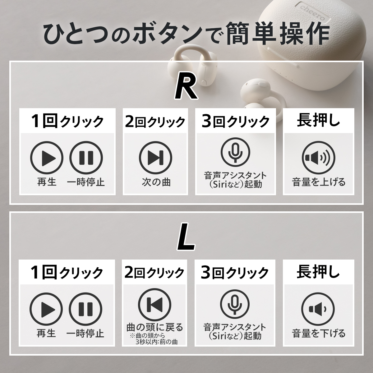 ●触れても音楽が止まらない、安心の物理ボタン操作ボタンに意図せず触れてしまっても誤操作が起きないよう、タッチセンサー式ではなく物理ボタンを採用。音楽や通話をストレスなく楽しめます。