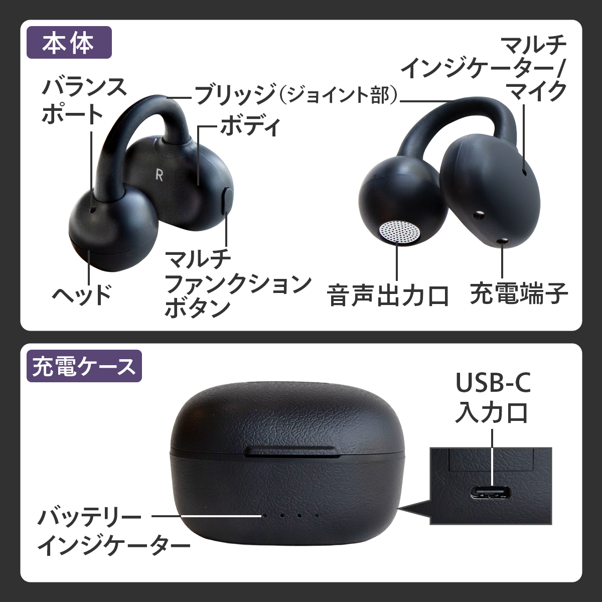 ●耳をふさがない、快適なオープン設計イヤーカフのように装着できるオープン型ワイヤレスイヤホン。圧迫感がなく、長時間の使用でも快適です。