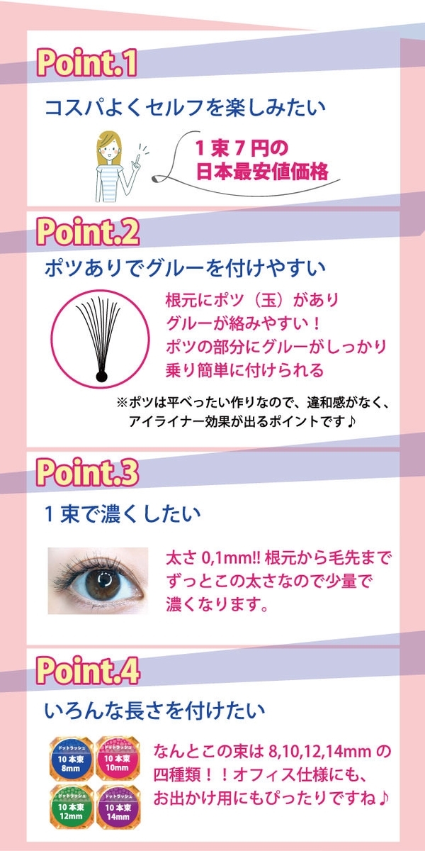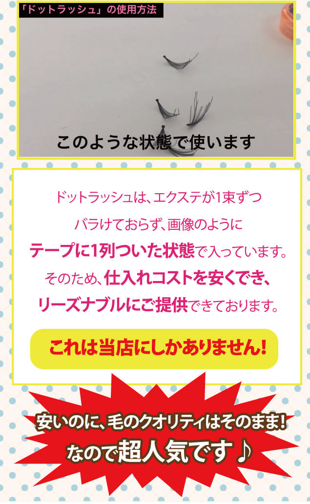 ※ドットラッシュは、根元が小さいためトロミのあるグルー(セルフトップグルー)を使用してください。