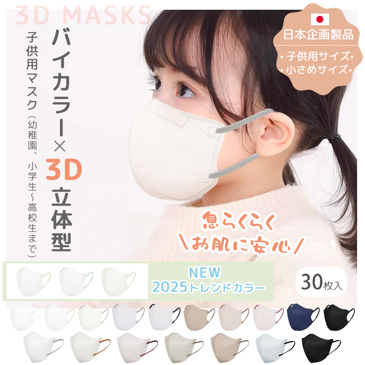 爆買★お肌に安心 マスク 子供用 立体マスク 不織布 こども マスク バイカラーマスク 3D 子供 キッズ 息しやすい 小学生 幼児 男の子 女の子 30枚 給食 花粉対策