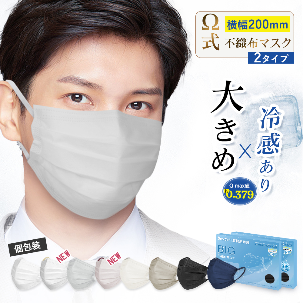 爆売れ中★冷感マスク 不織布 大きめ Ω式プリーツ 立体マスク 大きいサイズ メンズ 使い捨て カラーマスク 黒 グレー 白 男 個包装30枚 耳痛くない 花粉対策