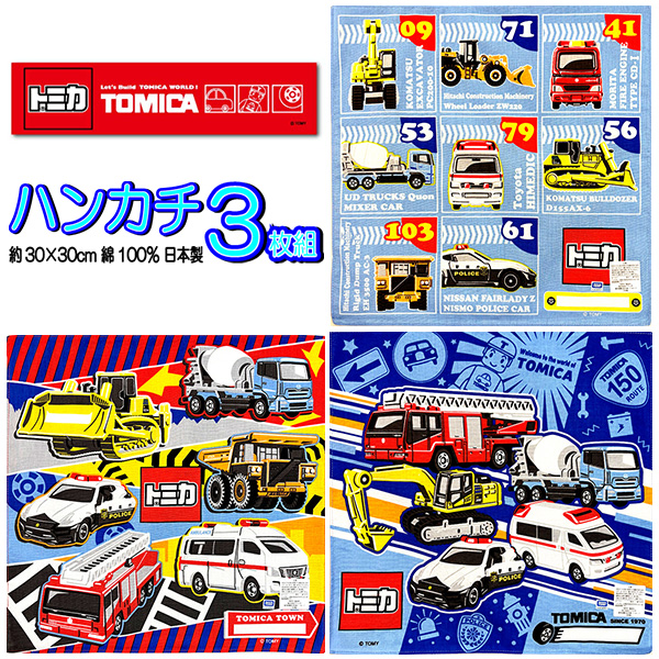 トミカ ハンカチ 3枚セット 子供 キャラクター 自動車 パトカー 工事車両 緊急車 救急車
