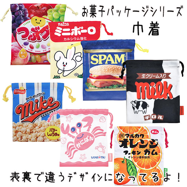 巾着 Sサイズ お菓子シリーズ つぶグミ ミニボーロ SPAM チロル ポップコーン かにぱん フーセンガム 子供 表裏柄違い ユニーク 給食袋