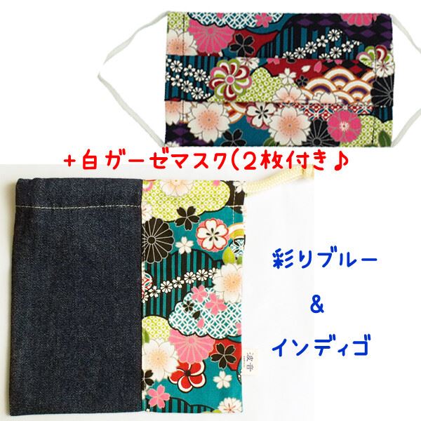 《白ガーゼマスク(2枚) 付き!!》マスク入れ&マスク 彩りブルー☆大人ふつうサイズ☆日本製 rack