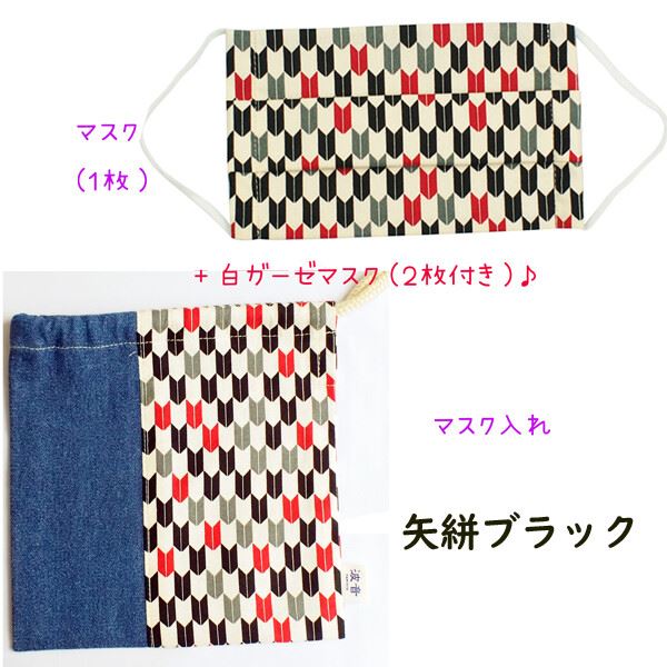 《白ガーゼマスク(2枚) 付き!!》マスク入れ&マスク 矢絣ブラック☆大人ふつうサイズ☆日本製 rack