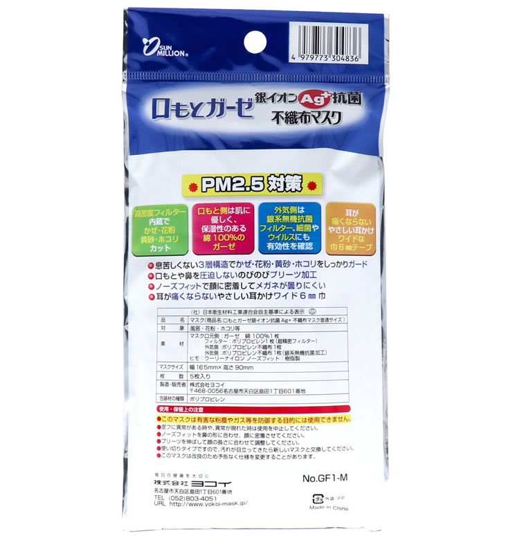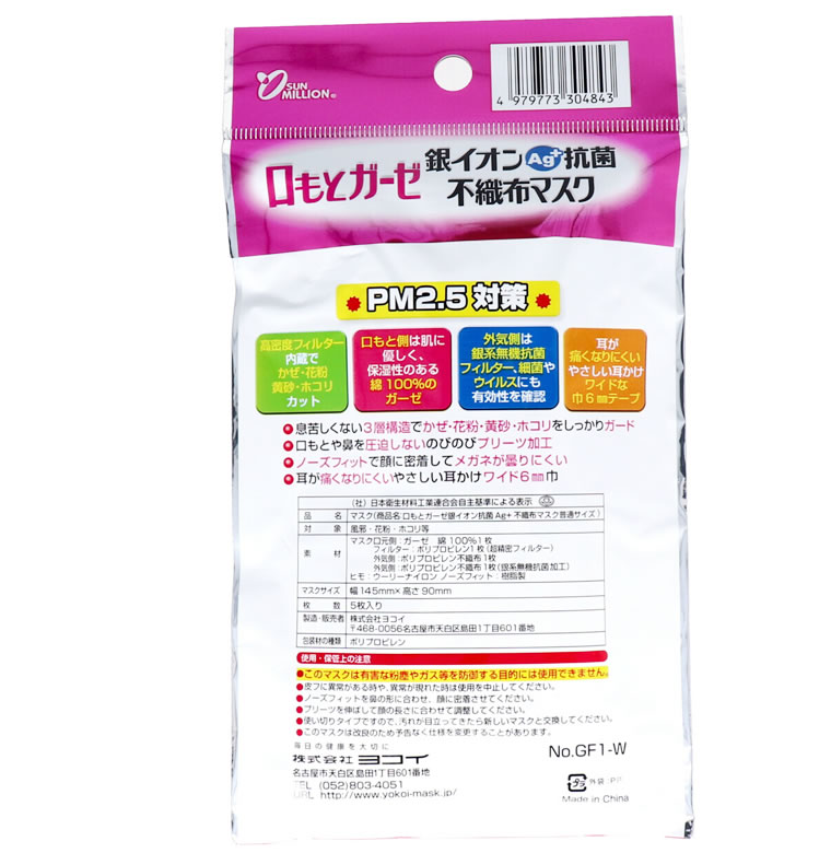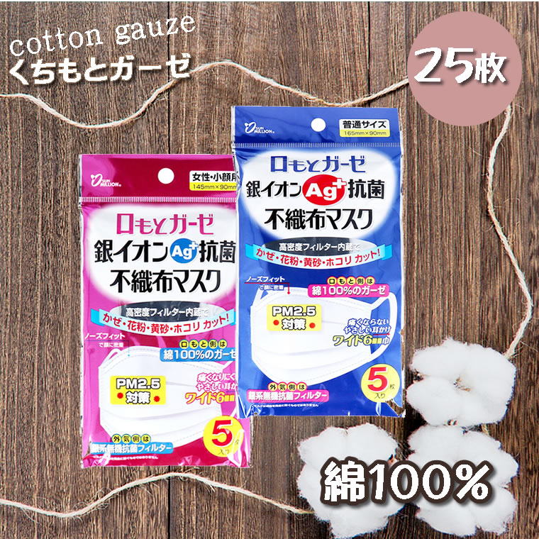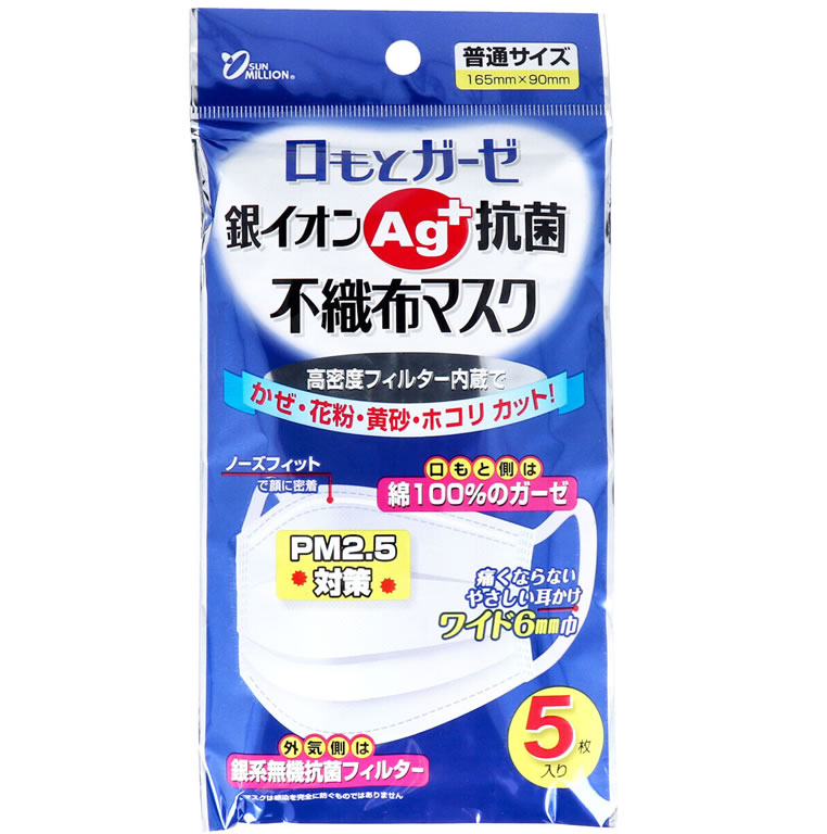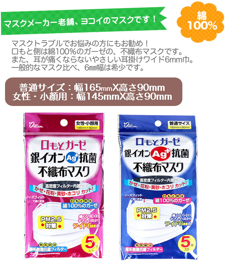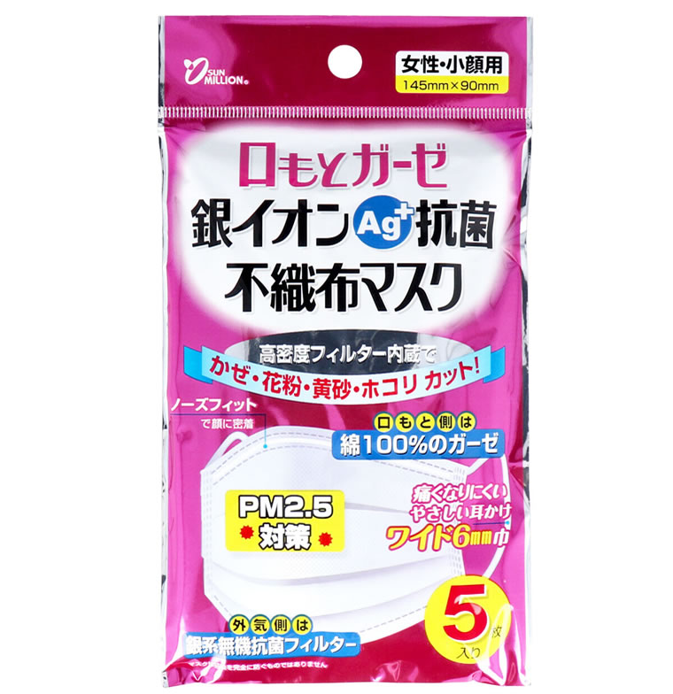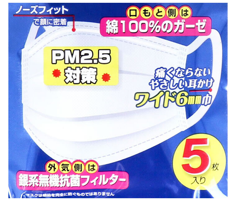 ●口もと側は綿100%のガーゼ。●外気側は銀系無機抗菌フィルター。●口もとや鼻を圧迫しないのびのびプリーツ加工。●ノーズフィットで顔に密着してメガネが曇りにくい。●耳が痛くならないやさしい耳掛けワイド6mm巾。●使用している銀系無機抗菌剤は細菌類やウイルスにも有効性を確認。