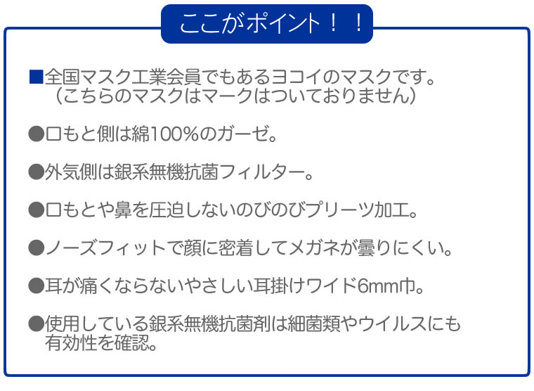 マスクメーカー老舗、全国マスク工業会員でもある株式会社ヨコイのマスクです。(こちらのマスクには全国マスク工業会マークはついておりません)