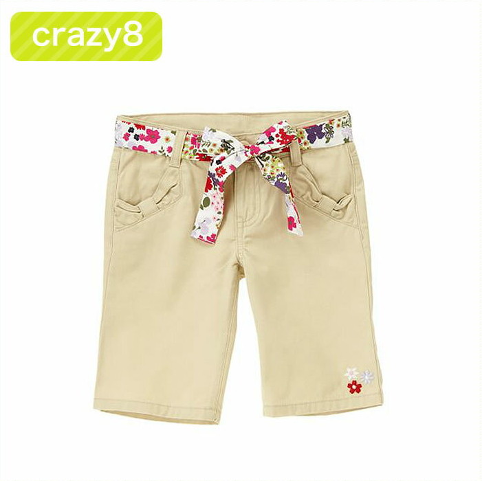クレイジー8のベージュのバミューダパンツです。花柄のウエストリボンがキュート!裾にお花の刺繍と、ポケットにもリボンが付いています。ウエストリボンは取り外し可能です。