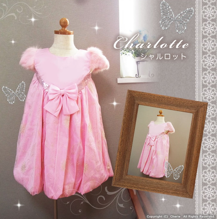 肩のボアとリボンを飾るシルバーのキラキラがとってもかわいらしいプリンセスドレス。すそがバルーンのようなデザインでとってもキュートなんです。胸元はシンプルだからアクセサリーもとっても良くあいますよ。後ろはリボンでしばれるようになっているので、形の調整がし易いデザインです。裾のレースの刺繍(ツタやお花)も個性的でドレスに高級感をアップ♪