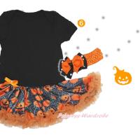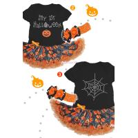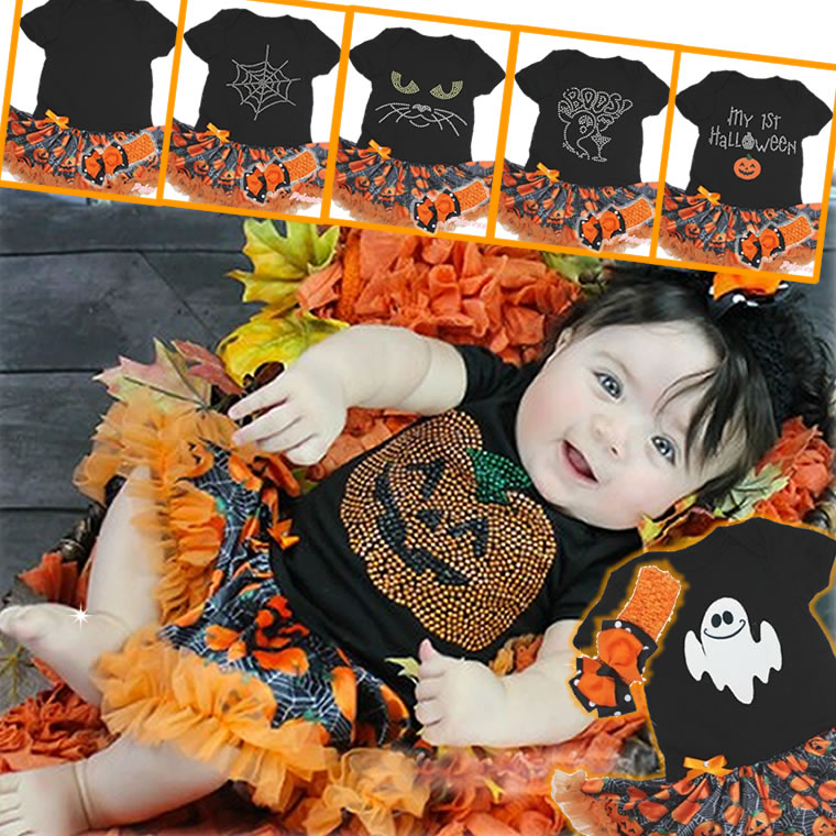 蜘蛛の巣模様のバックに沢山ならんだカボチャが可愛いロンパースチュチュとヘアアクセサリーのセットです♪