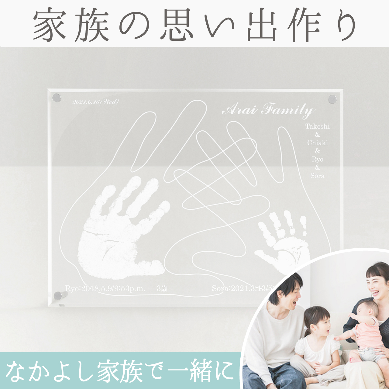 ご両親の手形(線画)1つずつ/手形1つずつ/ご家族のお名前/苗字/生年月日/出生時間/年齢/手形をとった日付