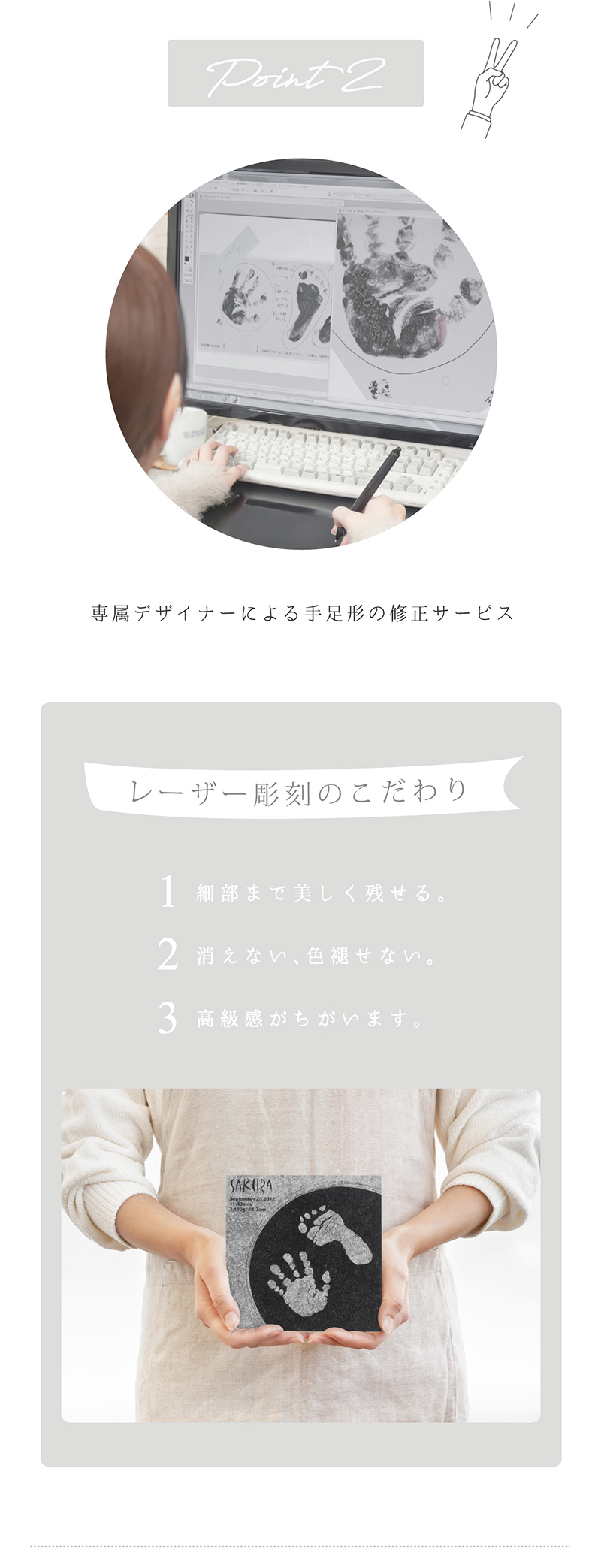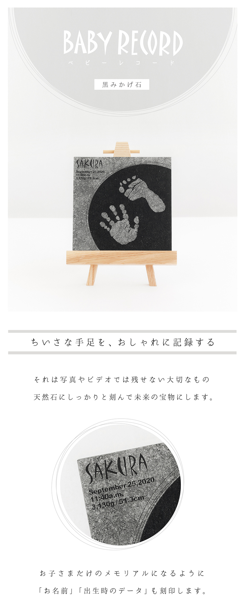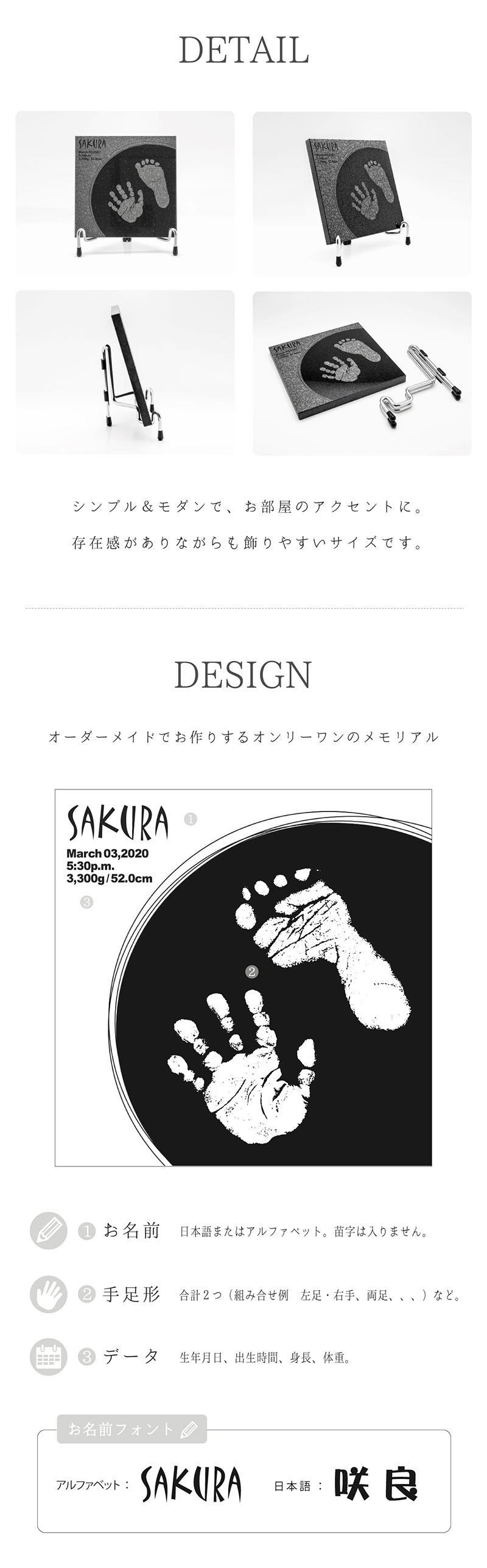 両手足形のうちいずれか2つ/お名前/お誕生日/出生時刻/身長/体重※制作に関するご希望は、ご注文後にお送りする「お申込用紙」にご記入ください。