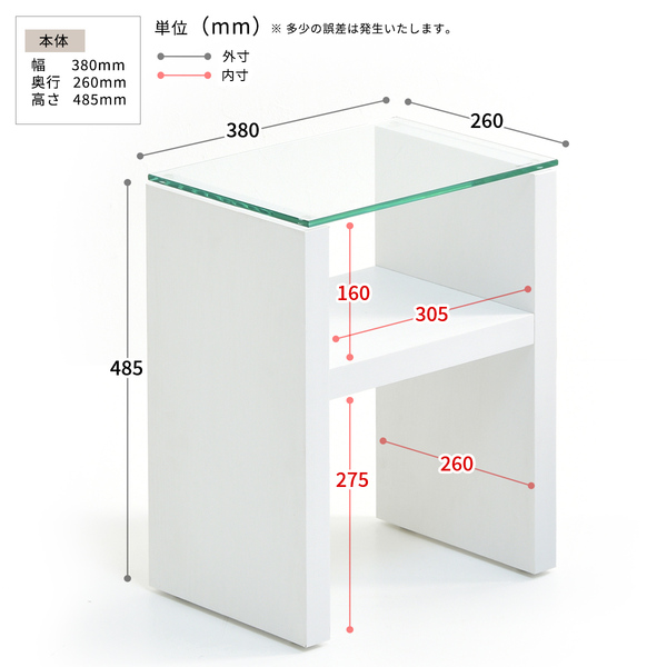 ■素材:天板/8mm強化ガラス、棚板・側板/中質繊維板にPVC貼り(塩化ビニルシート)