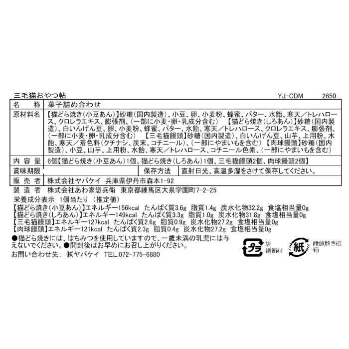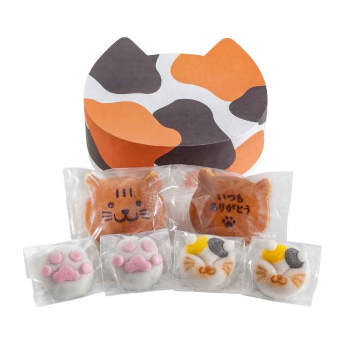 <内容量>猫どら焼き(小豆あん・しろあん×各1)、三毛猫饅頭・肉球饅頭×各2(計6)