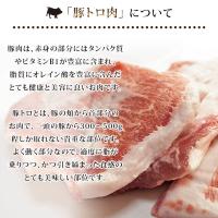 豚肉は、赤身の部分にはタンパク質やビタミンB1が豊富に含まれ、脂質にはオレイン酸が豊富に含まれた、とても健康、美容に良いお肉です。その中でも豚トロは、豚の頬から肩(首)部分のお肉で、一頭の豚から300?500g程しか取れない貴重なお肉です。
