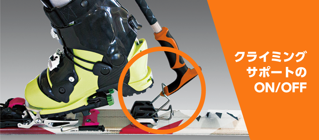 ビンディング操作を想定し、クライミングサポートのON/OFF等、快適なバックカントリースキーをサポートします。