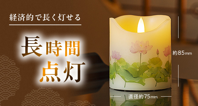 単4乾電池3本で約160時間連続点灯(電池別売り)。日々のお参りや法事、お盆、命日など長時間使用にも対応。