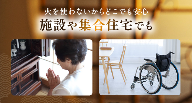 火災や煙、すすの心配がなく安心。高齢者やお子様、ペットのいるご家庭でも安全。集合住宅や火気使用が制限される施設にも対応。