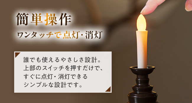 LEDの灯りで、火を使わず安心して供養ができるろうそくです。火災や煙の心配がなく、仏壇周辺に可燃物があっても安全。電池式でスイッチひとつの簡単操作。国内工場で製造された日本製で、品質にも信頼があります。