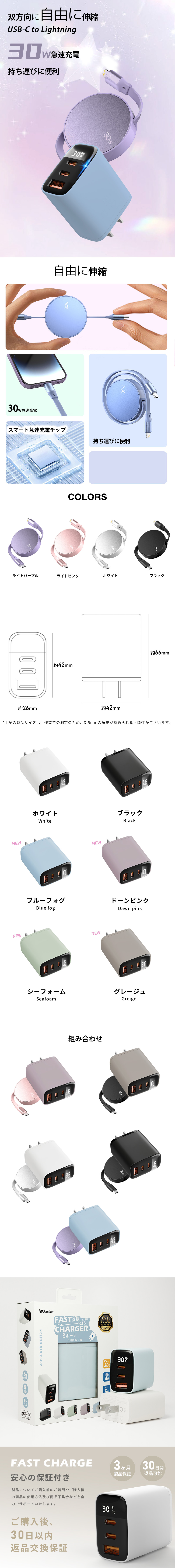 製品保証:お買い上げ日より3ヶ月間の無償保証リスカイから新しい体験をお届けします。PD30Wの急速充電器を開発しました!この充電器は、厳格な電気用品安全法(PSE)に認証されており、安全性と高速性を保証します。